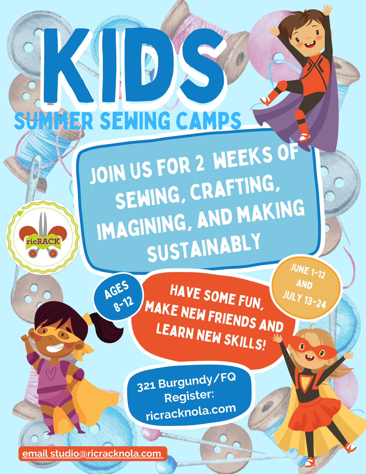 Join us for 2 weeks of sewing, crafting, imagining and making sustainably. Have some fun, make new friends, and learn new skills.